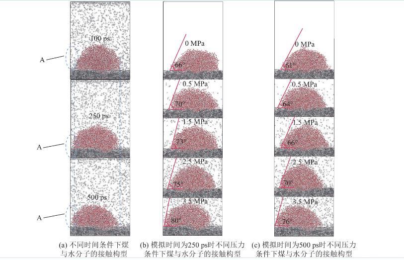 通過對比瓦斯壓力為3.5 MPa條件下,模擬時間為100、250、500 ps時,煤與水分子接觸構(gòu)型(圖13a)可以獲得如下規(guī)律:隨著時間的增加,水分子逐漸在煤表面鋪展,接觸面寬度逐漸增加,通過觀察圖13a中的區(qū)域A可以明顯發(fā)現(xiàn)此規(guī)律。通過對比同一瓦斯壓力、不同時間條件下,煤與水分子接觸構(gòu)型(圖13b—圖13c)發(fā)現(xiàn):隨著時間的增加,煤與水分子之間的接觸角逐漸減小。綜合分析可知,在同一瓦斯壓力條件下,隨著時間的增加,水分逐漸在煤體表面鋪展,水與煤之間的接觸角逐漸減小。通過對比同一時間條件下(圖13b—圖13c)可知,隨著瓦斯壓力的增加,煤與水分子之間的接觸角逐漸增加,其原因是瓦斯壓力越大,水分子越不易在煤表面鋪展且不易進(jìn)入煤中,水分越不容易潤濕煤。