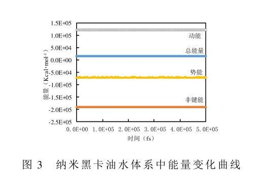 采用粒子-粒子-粒子-網(wǎng)格(PPPM)求解方法求解長(zhǎng)程庫倫相互作用力。運(yùn)用Polak-ribiere共軛梯度(CG)算法最小化能量,消除構(gòu)型重疊。系統(tǒng)溫度為298 K,壓力為1 atm,系統(tǒng)在等溫-等壓系綜(NPT)下進(jìn)行弛豫,對(duì)體系進(jìn)行壓縮,使模型達(dá)到實(shí)際密度狀態(tài)。使用Nosé-hoover恒溫器控制體系溫度,時(shí)間步長(zhǎng)1 fs,運(yùn)行1 ns。然后保持系統(tǒng)體積不變,設(shè)置相同的時(shí)間步長(zhǎng)和時(shí)間總長(zhǎng)運(yùn)行正則系綜(NVT)來穩(wěn)定體系,以確保體系的密度不變。最后,收集體系平衡后0.5 ns范圍內(nèi)的數(shù)據(jù),得到統(tǒng)計(jì)平均值。應(yīng)該注意的是,在每個(gè)階段運(yùn)行更長(zhǎng)時(shí)間并不會(huì)對(duì)模擬結(jié)果產(chǎn)生明顯的變化。模擬中水相和油相的平均密度分別為(0.989±0.008)和(0.728±0.002)g/cm3,近似實(shí)驗(yàn)值(溫度為298 K、壓力為1 atm時(shí),水和C10H22的密度分別為:0.997和0.730 g/cm3)。模擬結(jié)束后,單片納米黑卡在油水界面體系中的能量變化如圖3所示,其他體系能量變化亦有此規(guī)律。