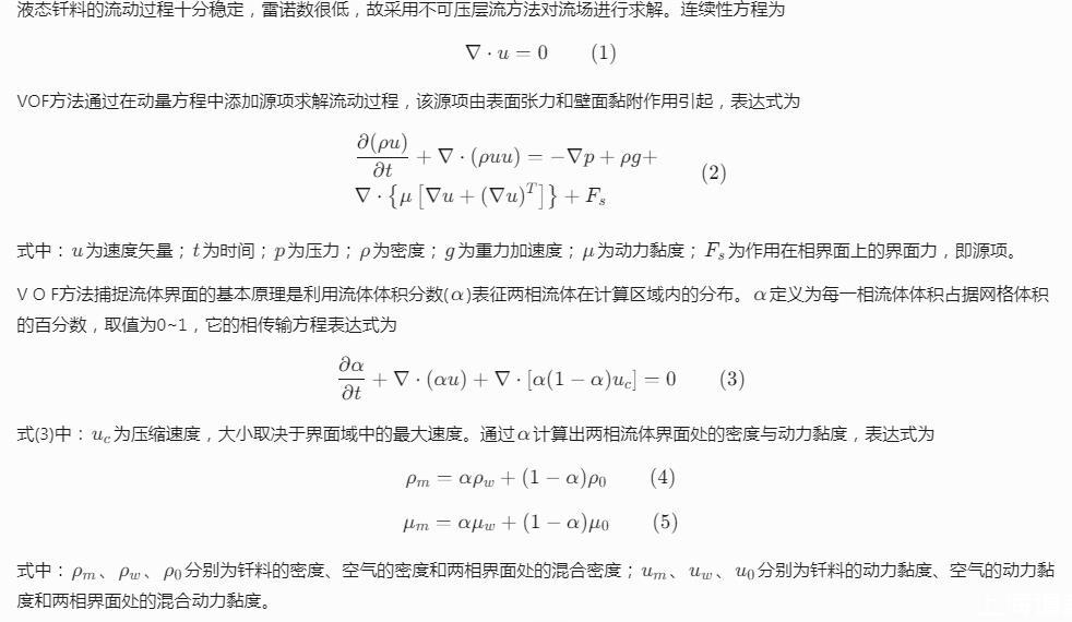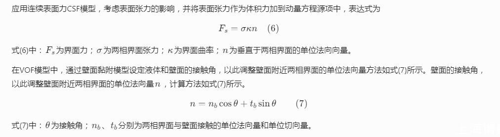 VOF方法通過在動量方程中添加源項求解流動過程,該源項由表面張力和壁面黏附作用引起,表達(dá)式為