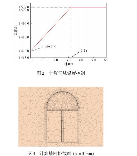 計算域網(wǎng)格截面(x=0mm)如圖3所示,整體上采用多面體網(wǎng)格,在釬料涂覆區(qū)域內(nèi)外均設(shè)置邊界層網(wǎng)格,為準(zhǔn)確捕捉多余釬料在母材表面的流失過程,對母材表面的網(wǎng)格進(jìn)行加密。