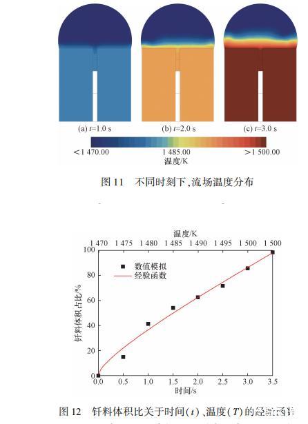圖11給出了不同時刻下的流場溫度分布。不同時刻下的釬料頂端的溫度場幾乎沒有變化,這是因為外部計算區域內充滿空氣,釬料與空氣之間的熱效率遠低于釬料和母材之間,故空氣對釬料的溫度控制影響是微乎其微的。釬料底部溫度隨著母材升溫迅速上升,由于相變潛熱的存在,使得上方釬料溫度分布始終保持在熔點以下(1470.0K)。