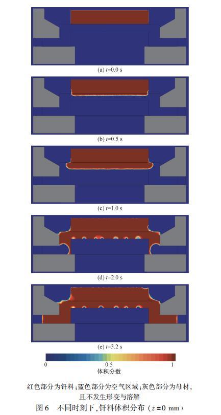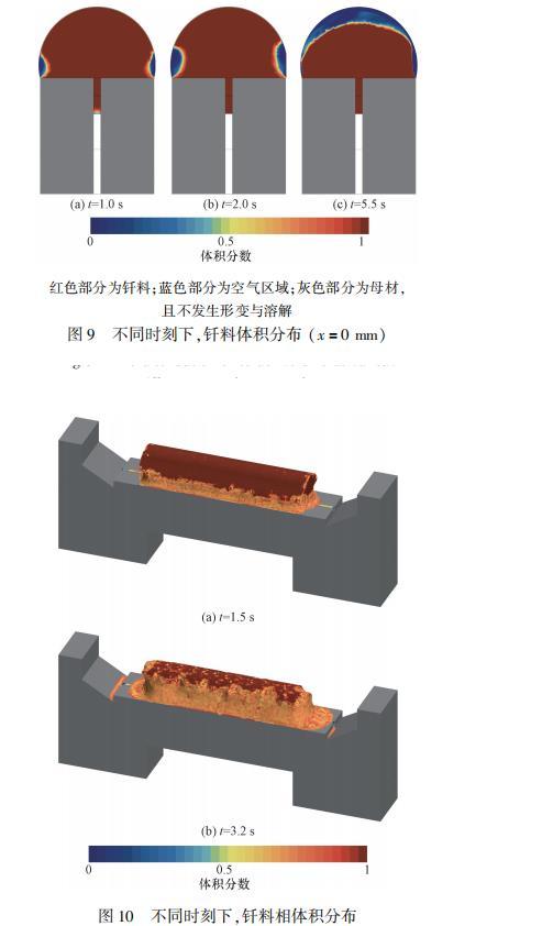 整個計算過程內的兩相體積分布如圖6所示。根據圖6可以看出焊縫內不同時刻下的釬料運動狀態。固態釬料溫度緩慢上升,當底部釬料達到熔點后開始融化,出現自由液面。釬料在表面張力和重力的作用下流入焊縫,整齊向下方流動,鋪展過程較為緩慢。t=1.0s時,液態釬料開始沿著焊縫通道向兩側運動,由于計算模型的限制,部分氣體未及時排出,在壁面上黏附形成許多虛假小氣泡。t=2.0s時,由于毛細力的作用,壁面附近的釬料運動快于中心位置,由此形成了“凹”形的流動前沿。當t=3.2s時,焊縫被釬料完全填充,流場達到穩定狀態,但焊縫上方表面的兩個角點直接暴露在空氣中,故該位置處的釬料填充效果略差。