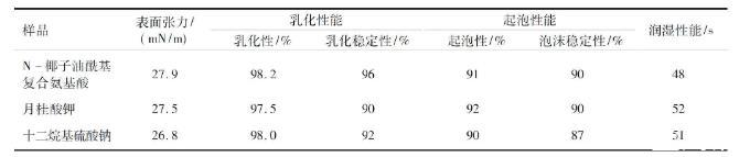 測定了以大豆粕為原料合成的N-椰子油?;鶑?fù)合氨基酸產(chǎn)物表面活性性能,同時與陰離子表面活性劑月桂酸鉀、十二烷基硫酸鈉表面活性進(jìn)行了比較,結(jié)果見表4。