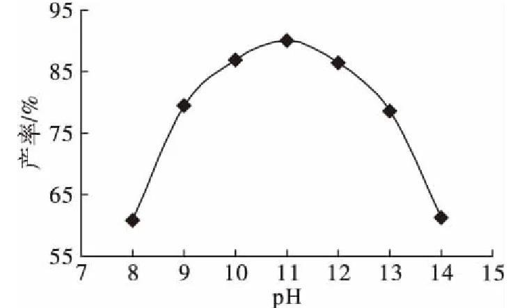 由圖2可以看出,pH影響產(chǎn)率的總體趨勢是首先逐步提高,達(dá)到最大值后逐步下降,pH為11時產(chǎn)物產(chǎn)率最大。因此,選擇pH 10~12進(jìn)行優(yōu)化試驗(yàn)。