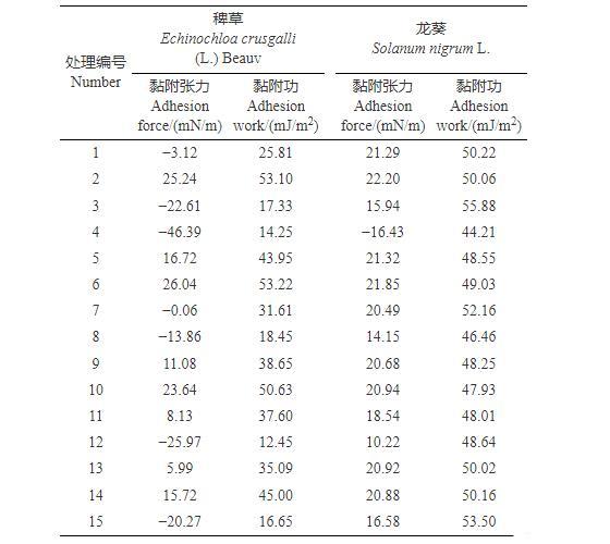 表4 15種處理作用于靶標作物時的黏附張力和黏附功
