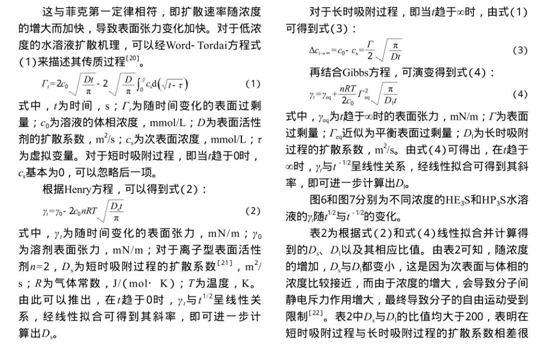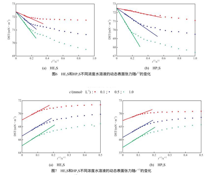 2)水溶液中的HE3S和HP3S分子可以快速擴(kuò)散到氣-液界面,迅速降低表面張力并達(dá)到平衡值,對于低濃度水溶液,這兩種表面活性劑的吸附過程都屬于混合動(dòng)力控制吸附。