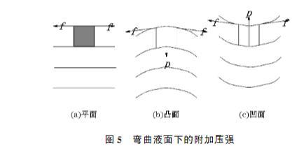 如果熔體表面是凸面,如圖5b所示,因表面張力沿周界與熔體面相切,則沿周界各個方向的表面張力f將產(chǎn)生一個指向熔體內(nèi)部的合力p(正壓力),使得熔體表面曲率變小。如果液面是凹面,如圖5c所示,表面張力的合力將指向熔體外部,對熔體則產(chǎn)生一個負(fù)壓力,使得凹面變平,甚至有可能轉(zhuǎn)化為凸面。由于表面張力的作用,熔體表面能夠截凸補(bǔ)凹,自動修復(fù),表面平滑,這正是陶瓷釉層表面能夠平整光滑的主要原因。