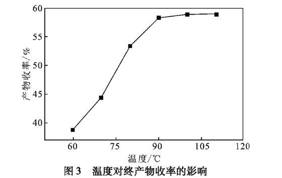 由圖3可知,GAC-312的收率隨反應溫度的升高而增大,從60℃上升至90℃過程中,產(chǎn)物收率的增幅很明顯,提高了多達二十個百分點;但當溫度超過90℃后,產(chǎn)率增加不明顯且反應體系的揮發(fā)現(xiàn)象較嚴重。這主要是因為升高反應體系溫度,活化分子數(shù)增加,有效碰撞的幾率加大,反應速率加快。但當溫度過高時,會導致副反應速率增大,同時也會提高體系揮發(fā)速率,造成N,N-二(3-氯-2-羥基丙烷-N-十二烷基仲胺)丙二胺二乙酸鈉產(chǎn)率提升不大,因此,N,N-二(3-氯-2-羥基丙烷)丙二胺二乙酸鈉與十二胺的最佳反應溫度確定為90℃。