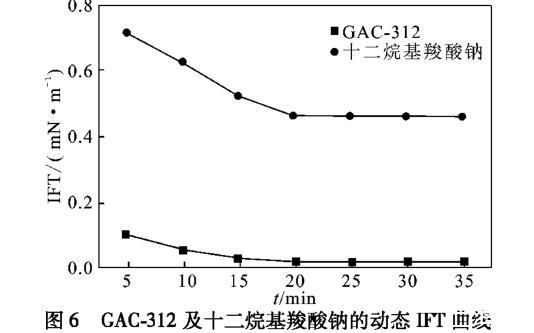 由圖6可知,羧酸鹽Gemini表面活性劑GAC-312在20 min內(nèi)可將油水界面張力降至7.6×10-3mN/m(超低界面張力級別),相同條件下,十二烷基羧酸鈉將界面張力僅降低至4.54×10-1mN/m,GAC-312界面活性優(yōu)異。GAC-312能夠具備優(yōu)秀的界面活性主要是由于羧基和水之間具有較強親和力,導致GAC-312可以更快、更好地吸附在界面上,其分子在油/水界面上的排列更緊密,降低油水界面張力的能力更強。