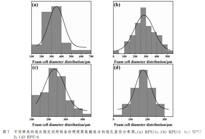 為了對(duì)聚氨酯泡沫孔徑大小和分布情況進(jìn)行量化,通過(guò)ImageJ軟件對(duì)SEM測(cè)試結(jié)果進(jìn)行處理分析,其孔徑分布直方圖如圖7所示。通過(guò)泡沫的孔徑分布直方圖對(duì)比結(jié)果可以看出,添加國(guó)產(chǎn)-1的聚氨酯泡沫孔徑分布范圍在100~700μm,存在較大直徑的泡孔,添加進(jìn)口-2的聚氨酯泡沫泡孔直徑分布范圍在0~550μm,雖然分布范圍有變窄,但也存在較大泡孔直徑,添加PAVE-5的聚氨酯泡沫泡孔直徑分布范圍在100~450μm,泡孔分布范圍減小,但仍然存在超過(guò)400μm的大泡孔,分布范圍最窄的是添加PGVF-6泡沫穩(wěn)定劑的硬質(zhì)聚氨酯泡沫,分布范圍在0~300μm,沒有超過(guò)400μm直徑的泡孔,泡沫泡孔直徑得以減小,泡沫泡孔細(xì)小均勻。這種微觀結(jié)構(gòu)上的改善可能得益于在發(fā)泡過(guò)程中,接枝APEG的POSS可以作為三維網(wǎng)絡(luò)結(jié)構(gòu)的交聯(lián)點(diǎn),通過(guò)其與聚氨酯基體的相容性,親水性-OH基團(tuán)有助于形成更加穩(wěn)定的泡沫結(jié)構(gòu)。
