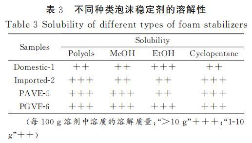 聚氨酯發(fā)泡過(guò)程中,各原料之間的相容性對(duì)泡沫的性能有重要影響。相容性好的原料可以確保發(fā)泡過(guò)程中的化學(xué)反應(yīng)順利且充分進(jìn)行,從而獲得均勻、細(xì)膩的泡沫結(jié)構(gòu),提高泡沫的物理性能和使用性能。表3是不同種類泡沫穩(wěn)定劑在不同溶劑中的溶解性測(cè)試,通過(guò)測(cè)試結(jié)果可知,經(jīng)過(guò)接枝改性后的PAVE-5和PGVF-6在多元醇和環(huán)戊烷中的溶解性較好,和國(guó)產(chǎn)-1、進(jìn)口-2等泡沫穩(wěn)定劑都能夠很好的溶解在多元醇和環(huán)戊烷中。PGVF-6和PAVE-5在多元醇中表現(xiàn)出的優(yōu)良溶解性主要得益于POSS接枝的APEG鏈段的醚鍵和羥基都具有明顯的極性,這使得其分子間以及與其他極性分子間可以形成較強(qiáng)的極性相互作用。這種相互作用有助于分子間的相容性,對(duì)聚氨酯泡沫的形成和性能有積極作用。