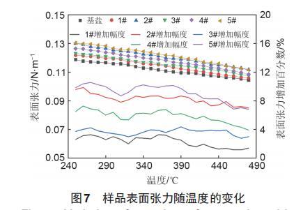 樣品的表面張力值隨溫度變化如圖7所示??梢钥吹剑?50~480℃內(nèi),基鹽的表面張力在0.1044~0.1188N/m,表面張力隨溫度的升高呈下降趨勢(shì)。1#納米熔鹽的表面張力在0.1059~0.1219N/m,對(duì)數(shù)據(jù)進(jìn)行擬合后,擬合系數(shù)在0.995以上,擬合程度較好。2#納米熔鹽的表面張力在0.1117~0.1301N/m,擬合系數(shù)為0.996,隨溫度變化的趨勢(shì)和基鹽及一般熔鹽表面張力的變化趨勢(shì)保持一致,均隨溫度的升高呈下降趨勢(shì)。3#和4#納米熔鹽的表面張力在0.1075~0.1232 N/m和0.1085~0.1265 N/m,擬合系數(shù)都在0.994以上,其中4#納米熔鹽的擬合系數(shù)與2#納米熔鹽的擬合系數(shù)相同,均為0.996,擬合程度最好。5#納米熔鹽的表面張力在0.1115~0.1305N/m,擬合系數(shù)為0.991。