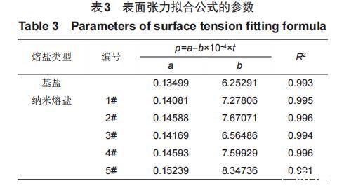 利用拉筒法對(duì)配制的基鹽及5種加入30nm SiO2納米顆粒的納米熔鹽的表面張力進(jìn)行測(cè)量,每隔10℃進(jìn)行一次測(cè)量,對(duì)得到的實(shí)驗(yàn)數(shù)據(jù)進(jìn)行整理和分析,擬合公式以及擬合系數(shù)見(jiàn)表3。