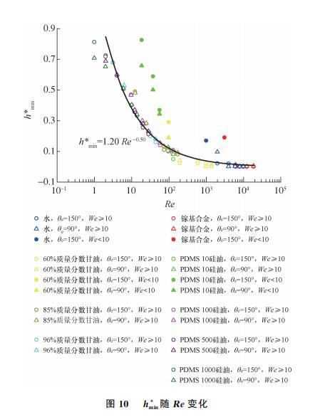 如表1所示,文認(rèn)為hmin僅與Re相關(guān)。從圖9中甘油溶液和PDMS硅油的曲線可以看出,二者Re相近,hmin幾乎相同,與已有結(jié)論一致;但對于We相近、Re相差較大的水和鎵基合金,二者也有相似的hmin.因此,hmin是否僅與Re相關(guān),需要進(jìn)一步探討。