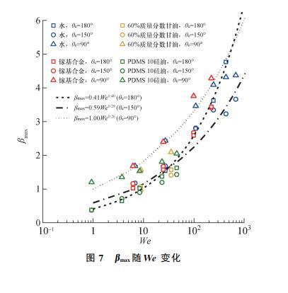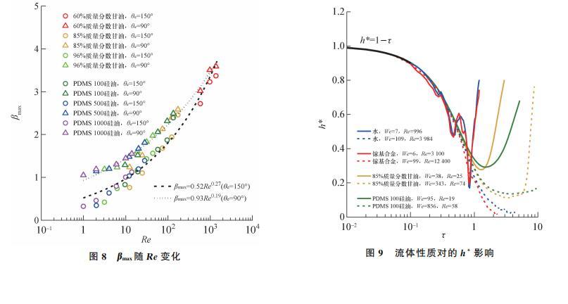 如表1所示,文指出在黏性力主導(dǎo)區(qū)(P>1)存在規(guī)律βmax∝Re0.2.本文在黏性力區(qū)的研究采用3種質(zhì)量分?jǐn)?shù)的甘油溶液、3種型號的PDMS甘油,黏度變化范圍為10——970 mPa·s,跨越近3個數(shù)量級。其中,黏度極高的PDMS1000硅油在低速碰撞壁面時有Re=1.