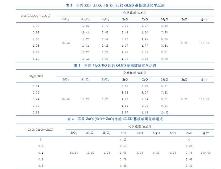 根據開發需求,本文設計了四組不同化學組成的OLED基板玻璃。如表1~表4所示,分別通過改變組成中的Al?O?/SiO?、RO/(Al?O?+B?O?)、MgO/RO和ZnO/(SrO+ZnO),研究表面惰性組分和表面活性組分的相對含量,以及同堿土金屬氧化物網絡作用相似但活性更強的過渡金屬氧化物對無堿鋁硅酸鹽玻璃表面張力的影響。