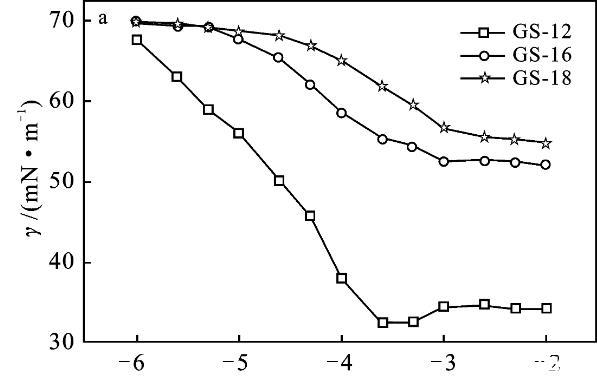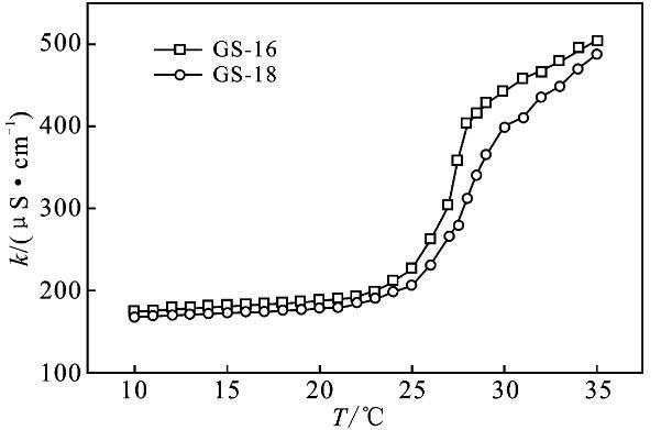 2.2.1 Krafft溫度Krafft溫度影響表面活性劑溶解度,表面活性劑在此溫度以上可以形成膠束。在Krafft溫度以下,以單分散的表面活性劑與水化固體表面活性劑的狀態(tài)存在,而在Krafft溫度以上,水化固體表面活性劑的溶解和膠束形成也參與了平衡[9-10]。質量分數1%表面活性劑GS-12,在室溫可以完全溶解,將其溶液置于冰水混合物中1周,溶液仍然澄清透明,沒有渾濁的跡象。表明GS-12的Krafft溫度低于0℃。通過測量電導率可以得到Krafft溫度的近似值,由圖3可知,GS-16,GS-18的Krafft溫度分別為27,27.5℃。k值在較低溫度下緩慢增加,這是由于離子表面活性劑的溶解度有限。隨著溫度的進一步升高,Krafft溫度處的k值急劇增加。k值的增加是由于膠束的形成,水合表面活性劑的溶解度突然增加,直至達到克拉夫特溫度。此外,離子遷移率增加隨著溫度增加、k逐漸增加[3,10]。結果表明,Gemini表面活性劑的Krafft溫度隨表面活性劑的疏水鏈長的增加而升高。