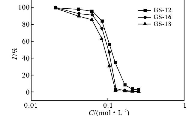 2.2.2耐鹽性能隨著鹽濃度的增加,濁度的突然增加是表面活性劑溶液中宏觀相分離的標志,這就是鹽析現象[7,11]。圖4為KBr/GS表面活性劑溶液,隨著KBr含量的增加,在波長為500 nm的吸光度變化曲線。以GS-12為例,當KBr濃度為0~60 mmol/L時,1 mmol/L的Gemini表面活性劑水溶液為無色透明,濁度同時略有下降,說明有混合膠束形成。當KBr的濃度從60 mmol/L增加到120 mmol/L時,溶液呈現微渾濁,說明體系中有少量的表面活性劑顆粒析出。而GS-16,GS-18在更低的濃度下就發(fā)生了鹽析現象。也就是說,鹽的析出現象是非常復雜的,這不僅取決于鹽的性質,而且取決于雙子表面活性劑的結構[12-13]。此外,由圖4透過率的變化可知,隨著疏水鏈的增長,表面活性劑的耐鹽性能減弱,更容易受鹽濃度的影響。因為無機鹽消除離子頭基團的電荷,減少吸附膜內頭基基團與膠束之間的靜電排斥。它們通過減少頭基之間的靜電相互作用和最小化有效截面積來促進膠束的產生和聚集,導致表面活性劑從溶液中聚沉而析出[13]。