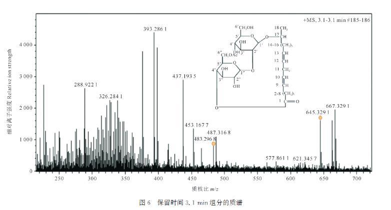 保留時間為3.1 min時色譜峰豐度最高。對該物質進行詳細分析,質荷比(m/z)645.32的碎片為單乙酰基取代的內酯型槐糖脂的分子離子峰,m/z 667.32為[M+Na]+峰,m/z 483.29為[M+H-C8H12O6]+峰,其中C8H12O6為乙?;〈黔h。上述分析表明此物質為內酯型槐糖脂,具體名稱為:17-L-[(2'-O-β-D-吡喃葡萄糖基-β-D-吡喃葡萄糖基)-O-]十八二烯酸-1',4″-內酯-6″乙酸酯。