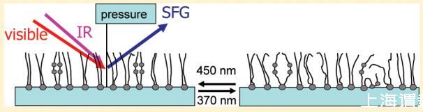 在此,我們研究了光開關脂質DT Azo-5P(圖1)的單層,其為純的,并與脂質1,2-二棕櫚酰-sn-甘油-3-磷酸膽堿(DPPC)混合。如圖1中的UV/vis光譜所示,光活性脂質可分別用370和450 nm的光從其反式狀態切換到順式狀態并返回。我們將表面壓力測量與無標簽、寬帶振動和頻率產生(VSFG)光譜相結合。10這些技術使我們能夠研究空氣-水界面上的脂質分子單層。可以獲得有關脂質與水分子相互作用的信息以及脂質的分子結構。在非線性光學技術VSFG中,紅外(IR)光束和可見光(VIS)光束在界面處組合,產生具有兩個入射光束和頻率的信號。如果紅外線與分子振動共振,信號就會強烈增強。已經證明,這種通過分子振動的技術提供了有關脂質分子構象和取向的信息。11-18在中心對稱介質中禁止和頻產生,因為這是一種二階非線性光學過程。19因此,該技術對中心對稱材料(如水表面)的最外表面分子層敏感。相反,缺少信號表明界面上的材料或分子群是中心對稱的。對于金表面偶氮苯功能化自組裝單分子膜,SFG在測定光異構化的截面和機理方面非常有用。得出的結論是,光異構化是由直接電子激發驅動的,類似于液相中的偶氮苯