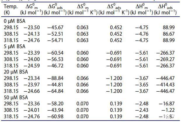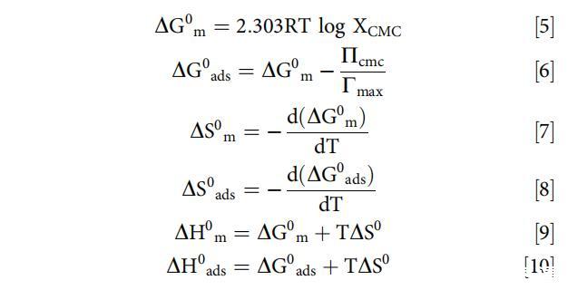 計算了在不同濃度和溫度下[C10-4-C10im]Br2在不存在和存在BSA的情況下的膠束化和吸附熱力學(xué)參數(shù),以確定溫度和BSA濃度的升高是否有利于膠束化(本體相濃度)或吸附 [C10-4-C10im]Br2的(界面濃度)。使用以下關(guān)系式計算各種熱力學(xué)參數(shù)。[79]
