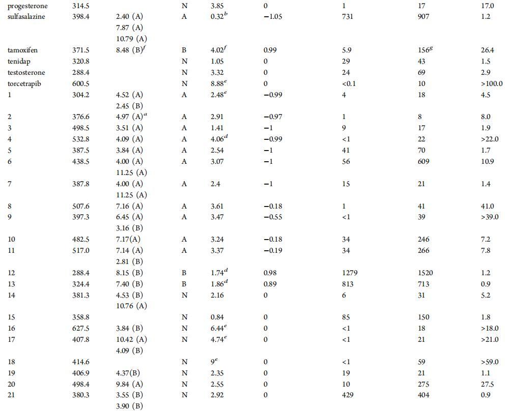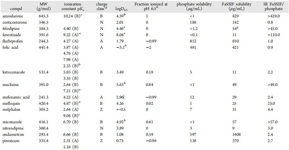 在FaSSIF和水性緩沖液中的溶解度評估和物理化學特性。選擇了一組21種上市藥物和30種來自不同研究項目的羅氏化合物,因為它們在pH值為6.5的水性緩沖液和FaSSIF介質中的溶解度不同。作為標準做法,所有溶解度和表面壓力剖面測量均在室溫下進行,而不是在37°C下進行。盡管溫度可能會影響藥物溶解度、脂質聚集體分配和溶解,據報道,?;悄懰崮z束的聚集數對溫度變化相對不敏感。19該化合物組包含不同的化學性質、廣泛的親脂性,并涵蓋不同類型和程度的電荷狀態,包括中性、酸性、堿性和兩性離子分子。表1列出了主要理化性質和溶解度數據。