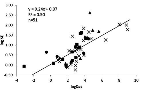 圖2。在pH值為6.5時,51種化合物的溶解度增強(SE=S_-FaSSIF/S_-水溶液)是辛醇/水分配系數的函數?;衔锉粴w類為酸(■),基地(▲),中性(×)和兩性離子(●).高于或低于檢測限的值在檢測限處繪制。