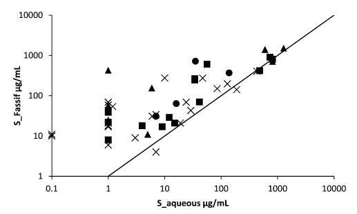 圖1。測定了51種化合物在磷酸鹽和FaSSIF緩沖液中pH值為6.5時的平衡溶解度?;衔锉粴w類為酸(■),基地(▲),中性(×)和兩性離子(●).線對應于單位線。低于檢測限的值在檢測限處繪制。