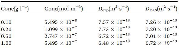 表1根據實驗G與t1/2曲線計算的不同濃度的擴散系數D(m2 s-1)值與使用DLS測量的值相比