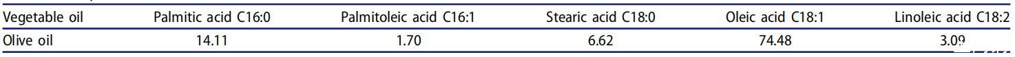 橄欖油含有各種脂肪酸甘油酯。我們使用GC-MS色譜法測定其結構和含量,如表1所示。顯然,橄欖油最主要的成分是油酸甘油酯(74.48%),其次是棕櫚酸甘油酯(14.11%)和硬脂酸甘油酯(6.62%)。