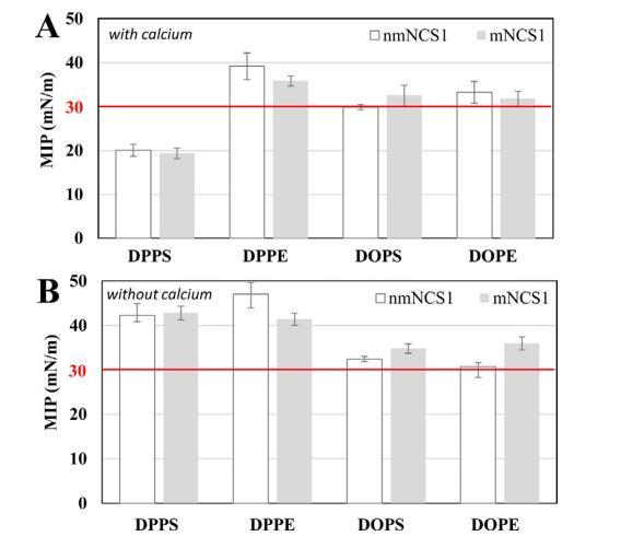 在沒有鈣的情況下,mNCS1采用無鈣構(gòu)象,其結(jié)合膜的方式與存在鈣的情況不同。圖5比較了在存在和不存在鈣的情況下獲得的mNCS1的MIP和synergy值(數(shù)值見表S4)。當(dāng)mNCS1不與鈣結(jié)合時,MIP值大于存在鈣的情況。事實上,在沒有鈣的情況下,所有MIP值都在30 mN/m以上,這表明當(dāng)?shù)鞍踪|(zhì)與鈣結(jié)合時,該蛋白質(zhì)能夠與任何膜蛋白結(jié)合。在沒有鈣的情況下,協(xié)同值也相當(dāng)高,表明mNCS1和膜之間有很強的協(xié)同作用,無論其成分如何。DPPE、DOPS和DOPE單分子膜缺鈣對結(jié)合參數(shù)的影響很小,分別使MIP增加5.57、2.28和4.16 mN/m,協(xié)同效應(yīng)分別增加0.16、0.00和0.07。無鈣構(gòu)象似乎限制了mNCS1與PE脂質(zhì)單層的膜結(jié)合。然而,在DPPS單層的存在下,MIP值增加了一倍多,從19.3 mN/m增加到42.8 mN/m。此外,在沒有鈣的情況下觀察到巨大的協(xié)同值增加。實際上,協(xié)同價值從?0.12至0.47,表明mNCS1的無鈣構(gòu)象應(yīng)隱藏其負電荷,并消除該單層與蛋白質(zhì)之間的排斥作用(圖4)。mNCS1的負電荷殘基應(yīng)埋在無鈣構(gòu)象中,并暴露在鈣結(jié)合構(gòu)象中,從而導(dǎo)致蛋白質(zhì)排斥。在DOPS存在的情況下,協(xié)同值從0.38降低到無鈣的情況下的0.23。DO脂肪?;湹莫毺貥?gòu)型可以解釋這一數(shù)據(jù)。然而,在沒有鈣的情況下,MIP和協(xié)同值相當(dāng)高,并且應(yīng)允許mNCS1與由DOP組成的脂質(zhì)結(jié)構(gòu)域的膜結(jié)合。