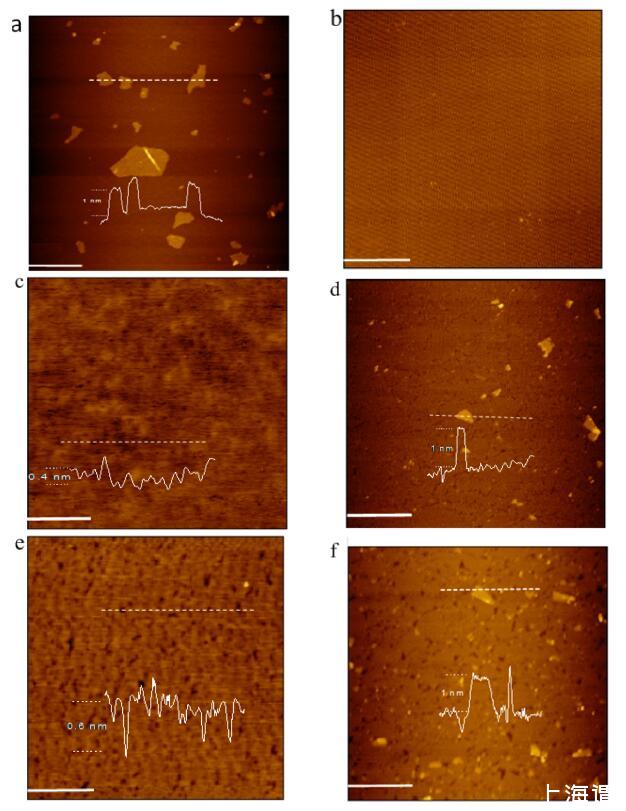 圖5.新切割云母表面上的AFM圖像(比例尺=1μm):(a)干燥后的一滴GO分散液;(b)LB膜在空氣中不沉積脂質的對照實驗?GO-水界面;(c)從空氣中轉移的DODAB LB膜?純水界面;(d)從空氣中轉移的DODAB LB膜?GO-水界面;(e)從空氣中轉移的DSEPC的LB膜?純水界面;(f)從空氣中轉移的DSEPC的LB膜?轉到水界面。所有脂質LB膜在20 mN/m的恒定表面壓力下轉移。