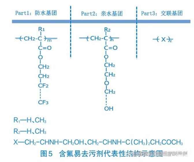 圖5為含氟易去污劑的主要結構含氟易去污整理劑分子中既含有防水防油基團——全氟烷基丙烯酸酯聚合物,又含有親水基團——聚氧乙烯鏈等??椢锝浾砗笕榛湺味ㄏ蚺帕性诶w維表面,排斥水性和油性污物,使其不易沾污。如果織物被污物沾附,在水洗液洗滌時,親水性鏈段定向排列在纖維與液體的界面上,吸引水分子,提高其易去污性能(也叫Filp-Flop,反轉凈洗效應)??椢锼春蠛娓?,親水鏈段脫水,氟烷鏈段重回其主導地位,再度呈現良好的防水防油性能。