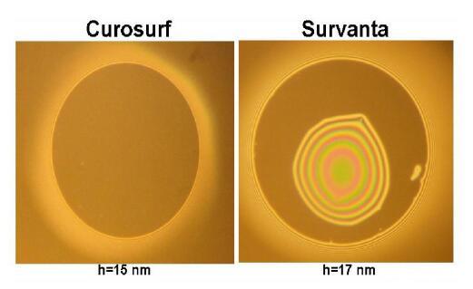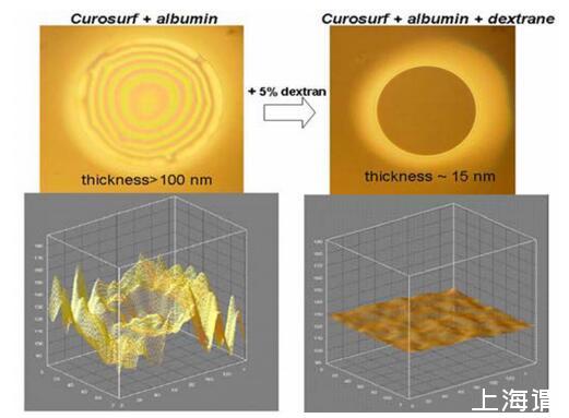 通過(guò)Curosurf和白蛋白將PEG 10000包含到混合FFs中不會(huì)改變膜類(lèi)型,并且FFs仍然厚且不均勻。相反,葡聚糖的加入導(dǎo)致了顯著的變化:觀察到薄膜變薄且穩(wěn)定的黑色薄膜(h=15 nm),類(lèi)似于在沒(méi)有白蛋白的情況下通過(guò)Curosurf獲得的薄膜(圖3)。