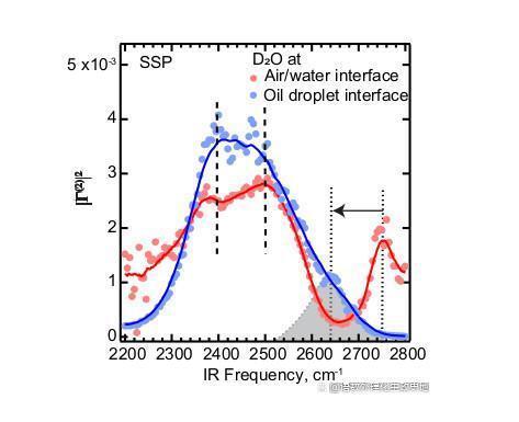 下圖顯示了分散的十二烷油滴(藍(lán)色圓圈)和空氣-水界面(紅色圓圈)的界面水(DO)光譜。(使用重水穩(wěn)定了實(shí)驗(yàn)條件,并將運(yùn)行時間減少了約40%。)水分子的振動頻率偏移部分取決于與相鄰分子氫鍵的強(qiáng)度。2400 cm^-1和2500 cm^-1處的垂直虛線標(biāo)記了氫鍵影響水的氧-氘鍵的頻率邊界。兩個接口的峰值頻率范圍大致相同。
