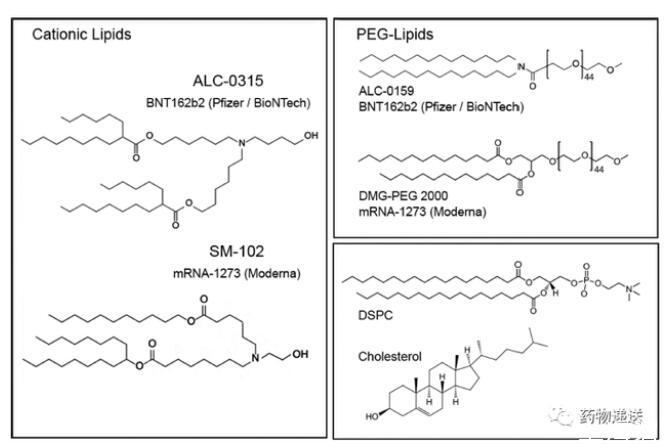 兩款mRNA疫苗采用的脂質納米粒組成非常相似。都含有可電離的脂質,該脂質在低pH值時帶正電利于與mRNA靜電作用絡合,在生理pH值時呈中性促進mRNA的遞送和釋放并減少潛在的毒性。都含有聚乙二醇化脂質,以減少血清蛋白的抗體結合和吞噬細胞的清除,從而延長全身循環時間。磷脂二硬脂酰磷脂酰膽堿(DSPC)和膽固醇形成穩定結構有助于包載mRNA。兩款疫苗的可電離陽離子脂質:PEG-脂質:膽固醇:DSPC的摩爾比分別為46.3:1.6:42.7:9.4(Pfizer/BioNTech)和50:1.5:38.5:10(Moderna)。脂質納米粒的粒徑為80~100nm,每個脂質納米粒中包含有約100個mRNA分子。