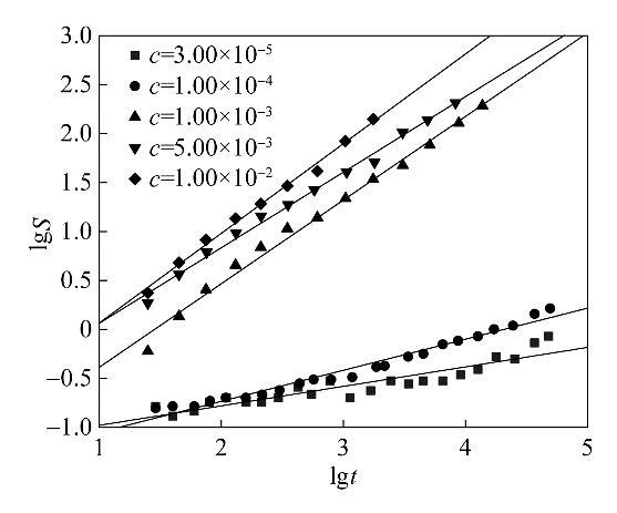 圖4不同濃度表面活性劑溶液的lgS-lgt曲線圖Fig.4lgS-lgtcurves of various aqueous