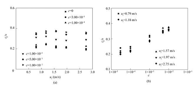 從圖7(a)中可以看出,當表面活性劑濃度保持不變時,射流破裂時間幾乎不隨射流速度的改變而改變。在射流速度保持不變時,隨著表面活性劑濃度的增大,射流破裂時間呈現逐漸增長的趨勢。在實驗參數范圍內,射流破裂時間均小于0.4 s。考慮重力對液體射流的加速作用,液體射流實際破裂時間要小于0.4 s。