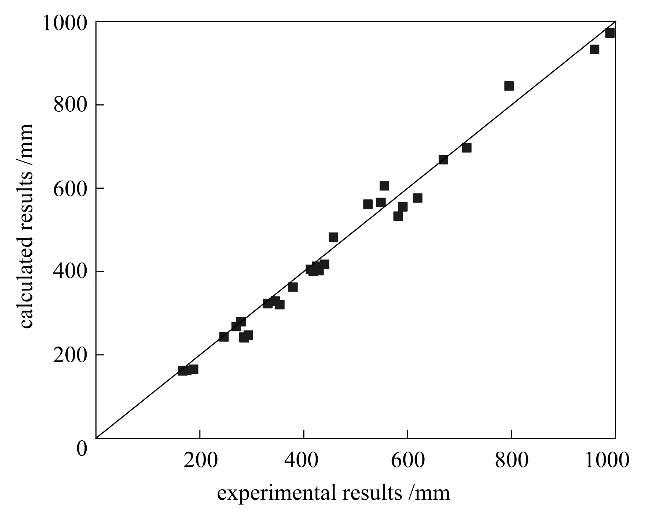圖9射流破裂長度實驗測量值與擬合計算值的比較Fig.9Comparison between experimental results and calculated results