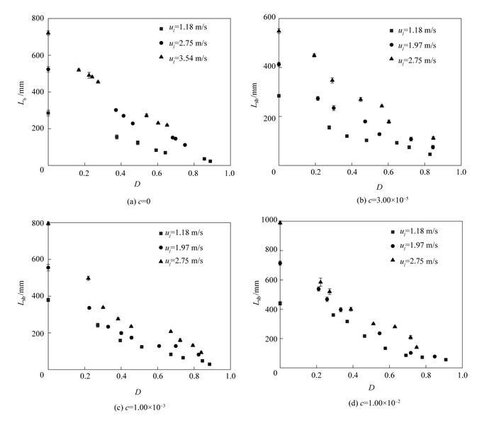 圖11是不同濃度表面活性劑射流破裂長度L sb隨氣泡無量綱直徑D=d b/d 0(d b為氣泡直徑)的變化。從圖中可以看出,不同表面活性劑濃度下,射流破裂長度隨氣泡無量綱直徑D的變化趨勢是相似的。射流破裂長度隨著氣泡直徑的增大逐漸減小;當氣泡直徑相同時,提高液體射流速度會導致更大的射流破裂長度。