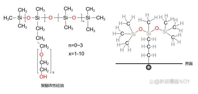 水性體系使用較多的有機(jī)硅潤(rùn)濕劑一般為聚醚改性硅油,相對(duì)分子質(zhì)量較小,n=0~3,x=1~10。同時(shí)大量的CH3鏈對(duì)外伸展,極大的降低表面張力,研究表明當(dāng)親水基在鏈段中部位置時(shí),效果最好。聚醚改性有機(jī)硅的分子結(jié)構(gòu)式和機(jī)理如上圖所示。