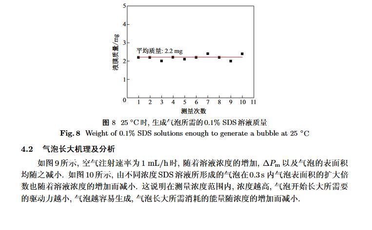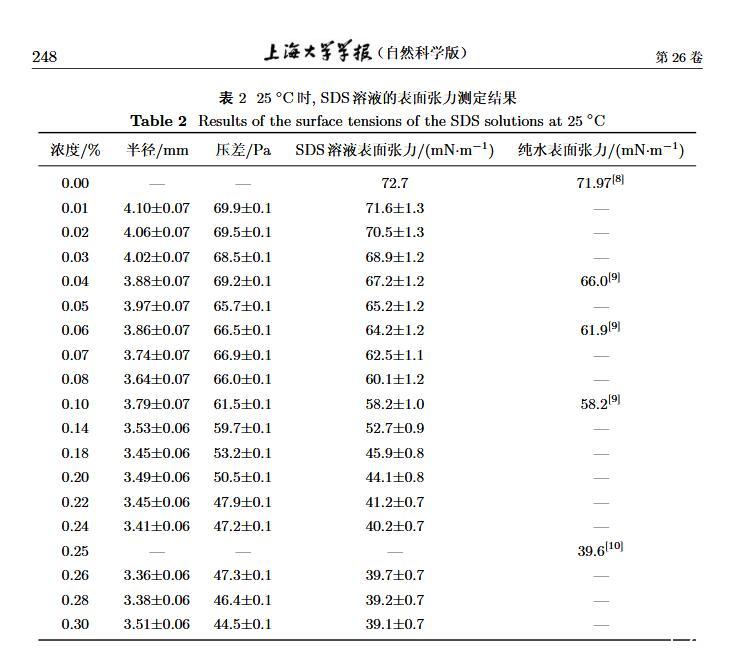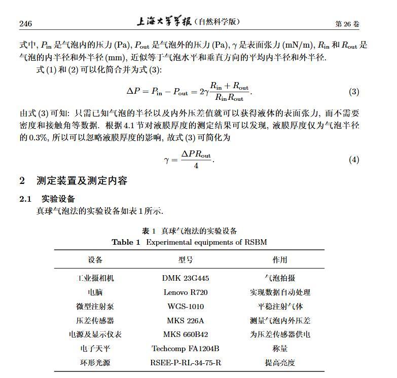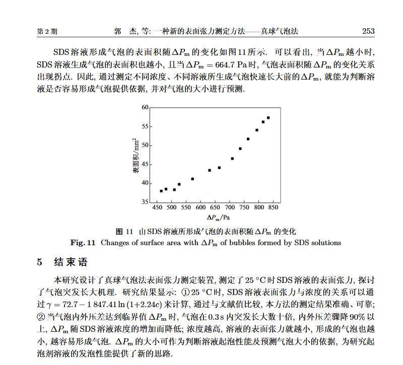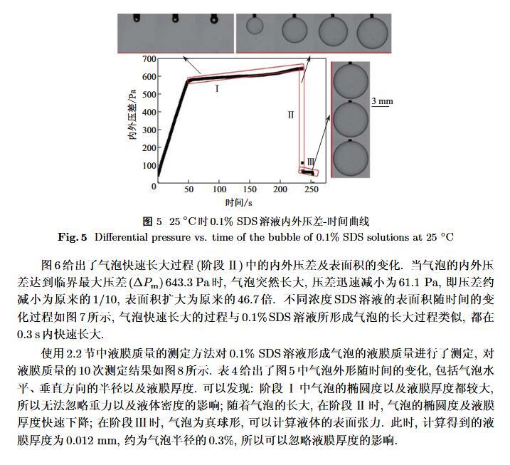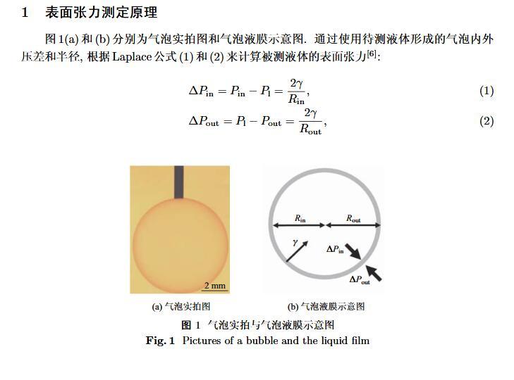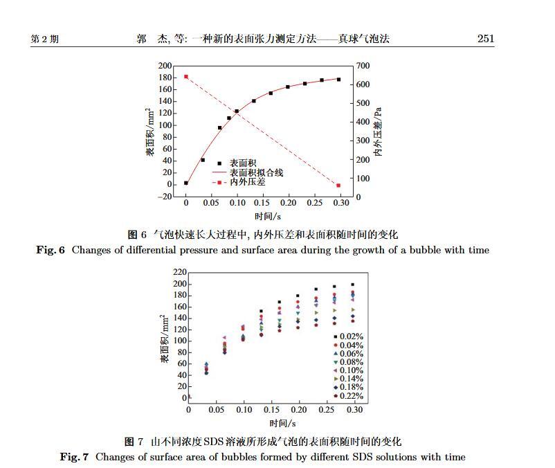設計了一個新的表面張力測定裝置,通過實時測定液膜氣泡的半徑及其內外壓差來獲得被測液體的表面張力。該測定液體表面張力的方法簡稱為真球氣泡法(real sphere bubblemethod,RSBM)。對十二烷基硫酸鈉(sodium dodecyl sulfate,SDS)溶液的表面張力進行了測定,結果與文獻值吻合,且測定裝置的絕對精度為98.2。通過檢測到的液膜氣泡突然長大所需要的最大壓差值及其表面積隨時間的變化過程,定量分析溶液起泡難易程度及氣泡大小的關系。