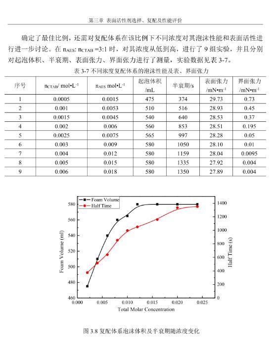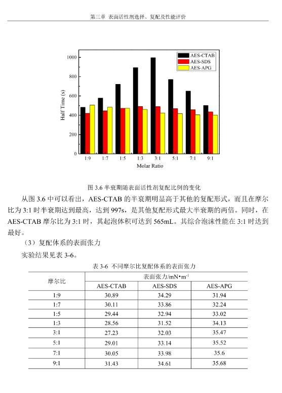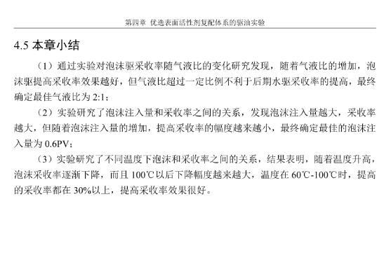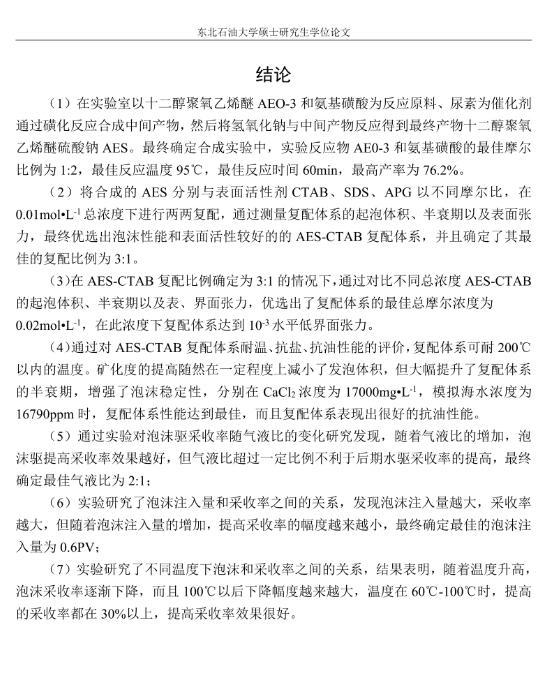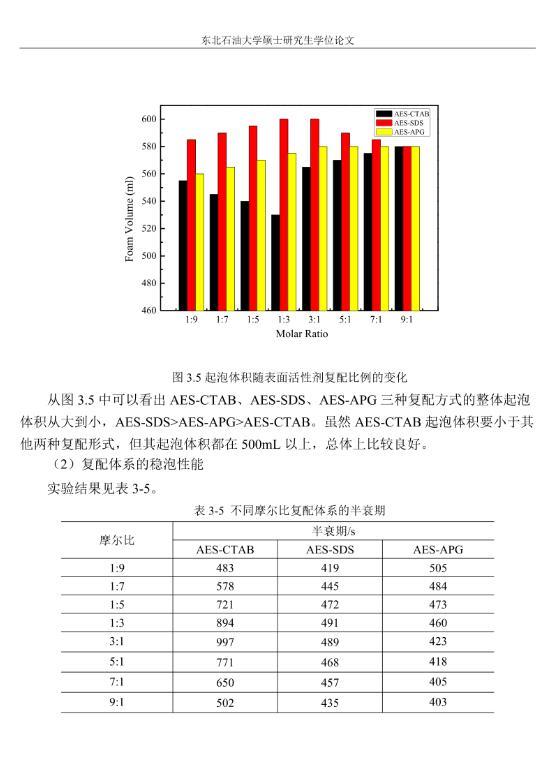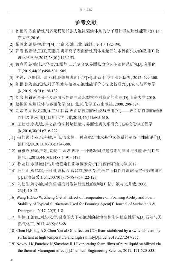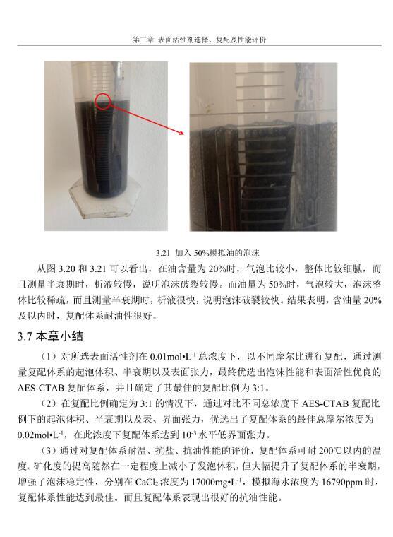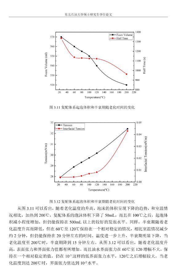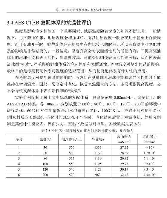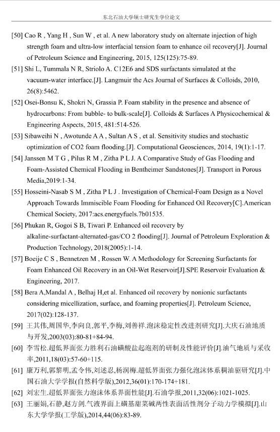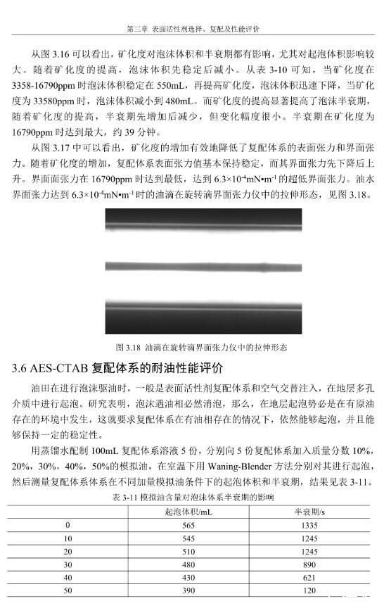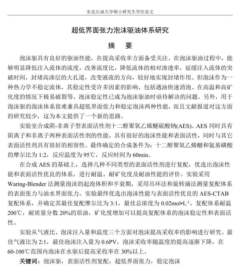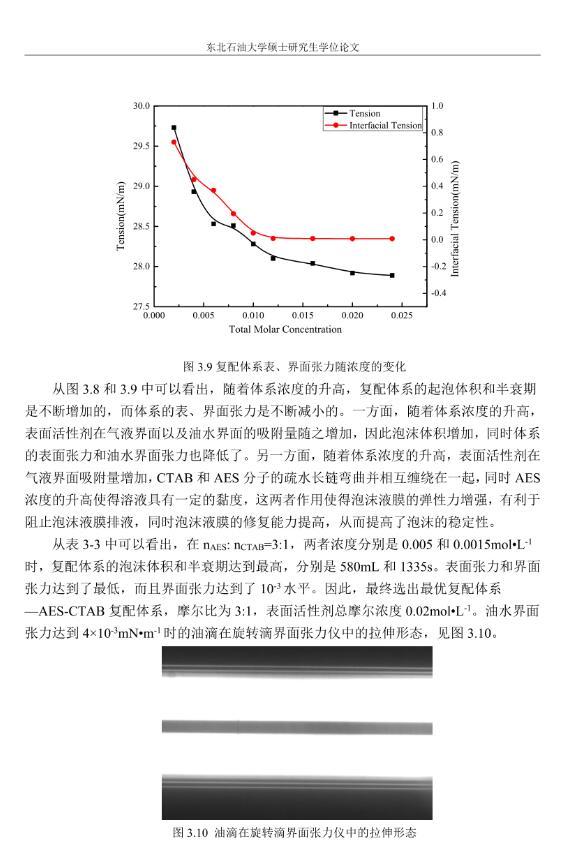 【摘要】:泡沫驅具有良好的驅油性能,在提高采收率方面備受關注。在泡沫驅油過程中,能夠明顯降低注入流體的流度,改善流度比,降低流體的相對滲透率,延緩注入流體的突破時間,封堵高滲層的大孔道,改變液流的方向,較好地實現封堵作用。但泡沫作為一種熱力學不穩定流體,其穩定性受許多因素的影響,包括遇油快速消泡、在高溫和高礦化度的情況下極易破裂等,泡沫穩定性已成為泡沫驅油時亟待解決的問題。另外,用于泡沫驅的泡沫體系很難兼具超低界面張力和穩定泡沫兩種性能,而且文獻報道對這方面的研究較少,這為本文提供了一個新的思路。實驗室合成陰-非離子型表面活性劑十二醇聚氧乙烯醚硫酸鈉(AES)。AES同時具有陰離子和非離子兩種表面活性劑的性能,具有很好的泡沫性能和表面活性,同時與其它表面活性劑具有很好的相容性。最終確定的合成條件為:十二醇聚氧乙烯醚和氨基磺酸的摩爾比為1:2,反應溫度為95℃,反應時間為60min。在合成AES的基礎上,選擇幾種不同類型的表面活性劑進行復配,優選出泡沫性能和表面活性優良的體系,進行耐溫、耐礦化度及耐油性能的評價。實驗采用Waring-Blender法測量泡沫的起泡體積和半衰期,采用吊環法和旋轉滴法測量復配體系的表面張力與油水界面張力。實驗最終優選出泡沫性能與表面活性優良的AES-CTAB復配體系,并確定其最佳復配摩爾比為3:1,最佳總濃度為0.02mol·L-1。復配體系耐溫200℃,耐質量分數20%的原油,礦化度增加可以提高復配體系的泡沫穩定性和表面活性。實驗從氣液比、泡沫注入量和溫度三個方面對泡沫提高采收率的影響進行研究。最佳氣液比為2:1,最佳泡沫注入量為0.6PV,泡沫采收率隨溫度的提高逐漸下降,在60-100℃范圍內泡沫在水驅后提高采收率在30%以上。