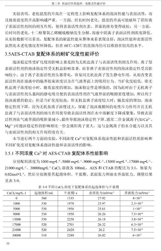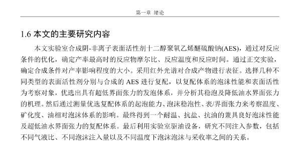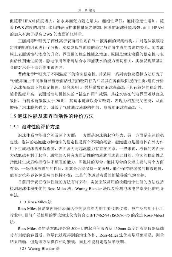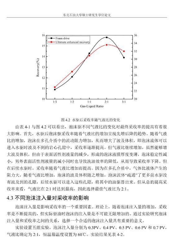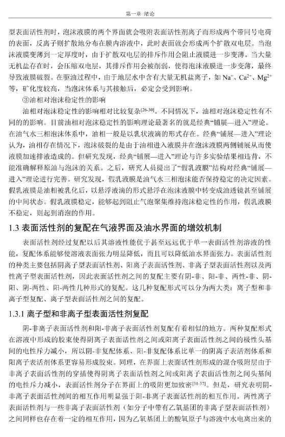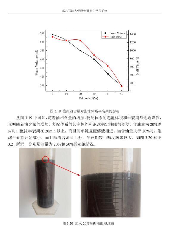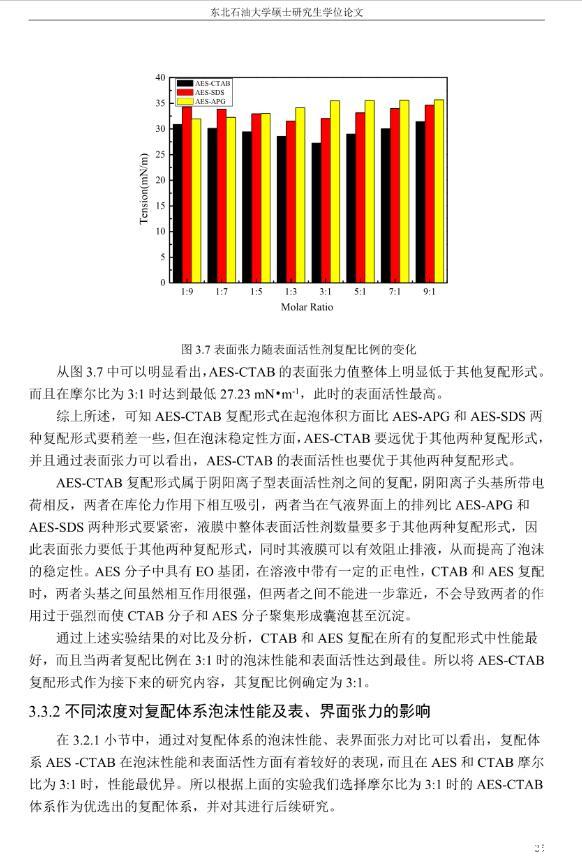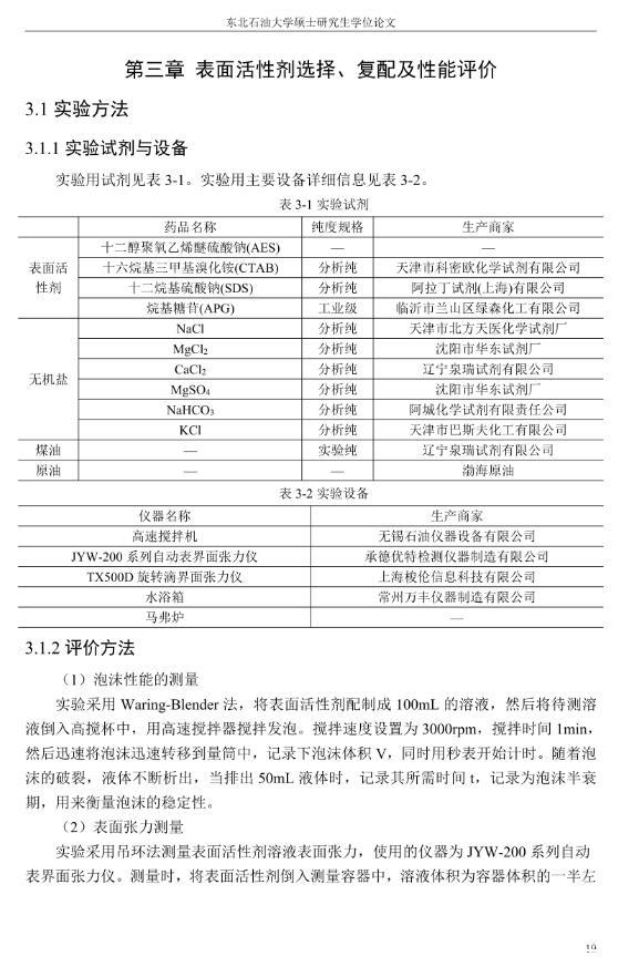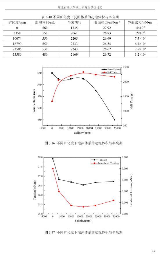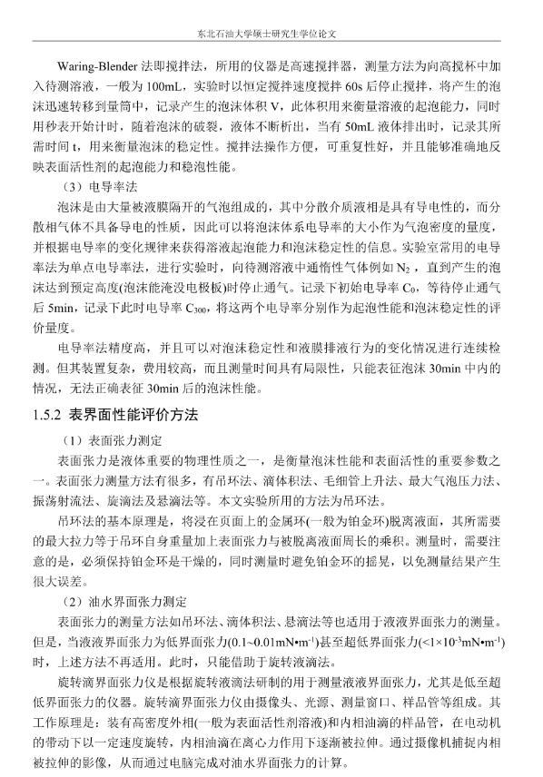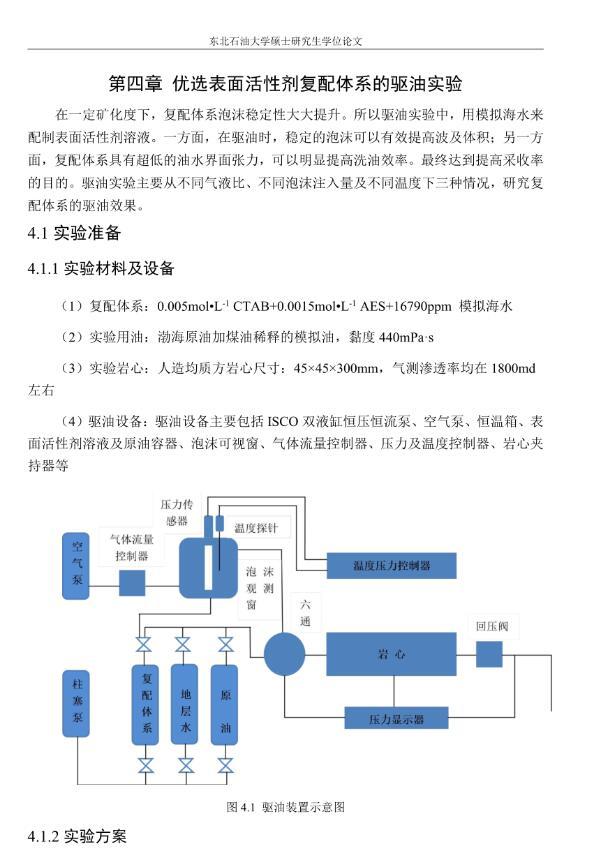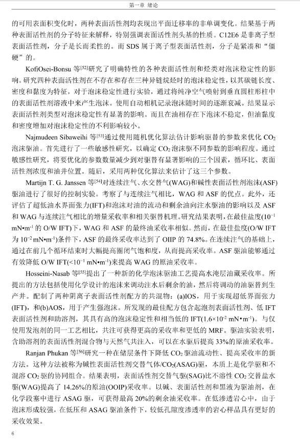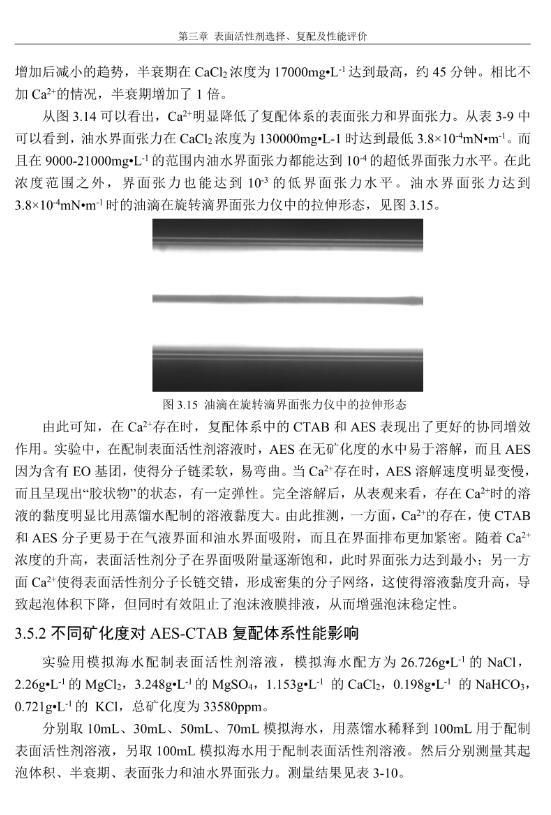 【摘要】:泡沫驅具有良好的驅油性能,在提高采收率方面備受關注。在泡沫驅油過程中,能夠明顯降低注入流體的流度,改善流度比,降低流體的相對滲透率,延緩注入流體的突破時間,封堵高滲層的大孔道,改變液流的方向,較好地實現封堵作用。但泡沫作為一種熱力學不穩定流體,其穩定性受許多因素的影響,包括遇油快速消泡、在高溫和高礦化度的情況下極易破裂等,泡沫穩定性已成為泡沫驅油時亟待解決的問題。另外,用于泡沫驅的泡沫體系很難兼具超低界面張力和穩定泡沫兩種性能,而且文獻報道對這方面的研究較少,這為本文提供了一個新的思路。實驗室合成陰-非離子型表面活性劑十二醇聚氧乙烯醚硫酸鈉(AES)。AES同時具有陰離子和非離子兩種表面活性劑的性能,具有很好的泡沫性能和表面活性,同時與其它表面活性劑具有很好的相容性。最終確定的合成條件為:十二醇聚氧乙烯醚和氨基磺酸的摩爾比為1:2,反應溫度為95℃,反應時間為60min。在合成AES的基礎上,選擇幾種不同類型的表面活性劑進行復配,優選出泡沫性能和表面活性優良的體系,進行耐溫、耐礦化度及耐油性能的評價。實驗采用Waring-Blender法測量泡沫的起泡體積和半衰期,采用吊環法和旋轉滴法測量復配體系的表面張力與油水界面張力。實驗最終優選出泡沫性能與表面活性優良的AES-CTAB復配體系,并確定其最佳復配摩爾比為3:1,最佳總濃度為0.02mol·L-1。復配體系耐溫200℃,耐質量分數20%的原油,礦化度增加可以提高復配體系的泡沫穩定性和表面活性。實驗從氣液比、泡沫注入量和溫度三個方面對泡沫提高采收率的影響進行研究。最佳氣液比為2:1,最佳泡沫注入量為0.6PV,泡沫采收率隨溫度的提高逐漸下降,在60-100℃范圍內泡沫在水驅后提高采收率在30%以上。