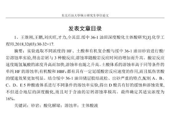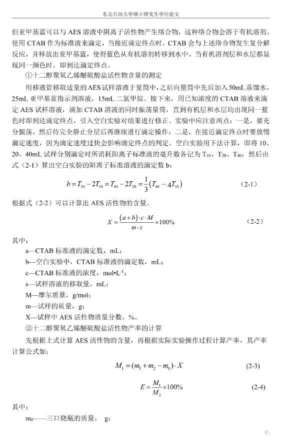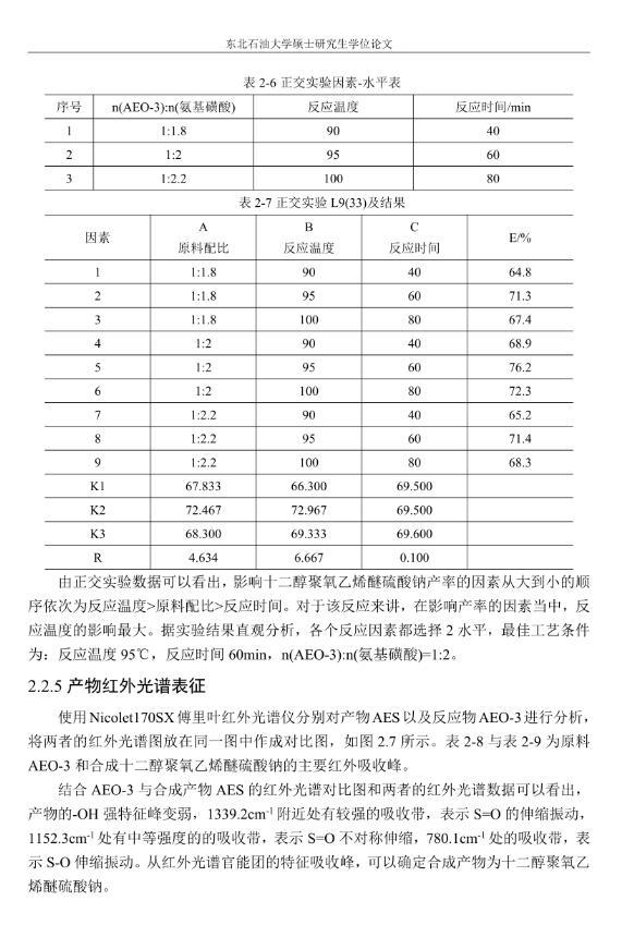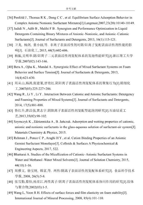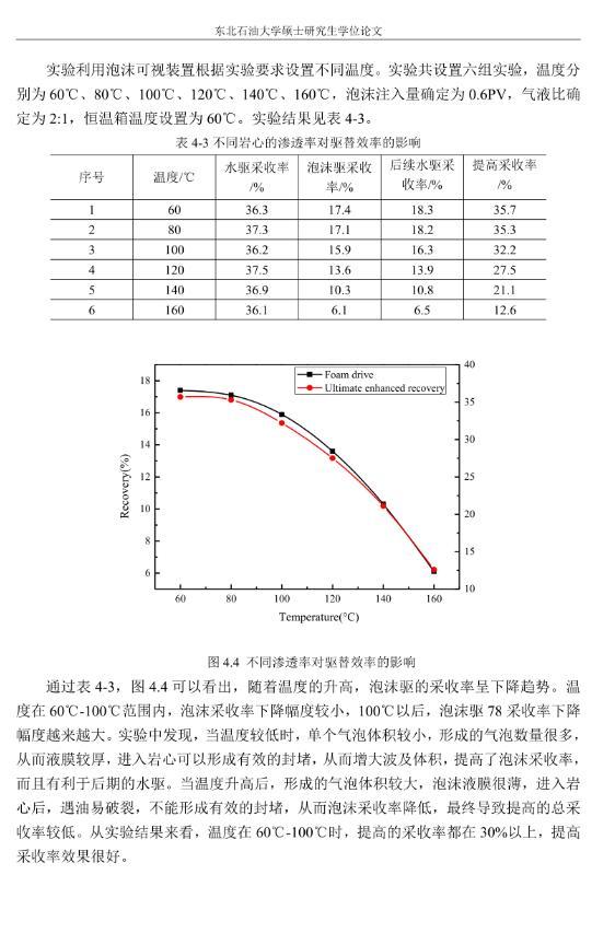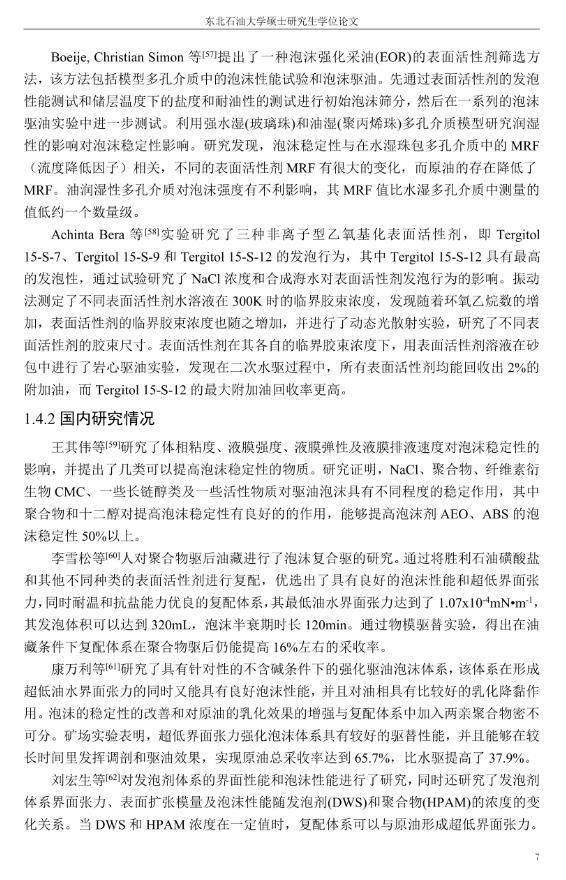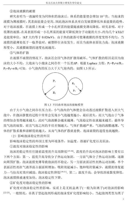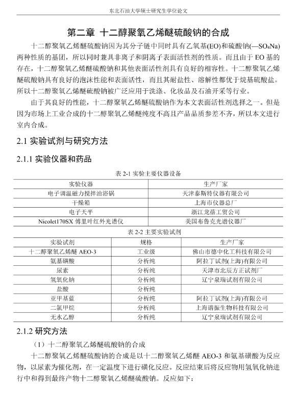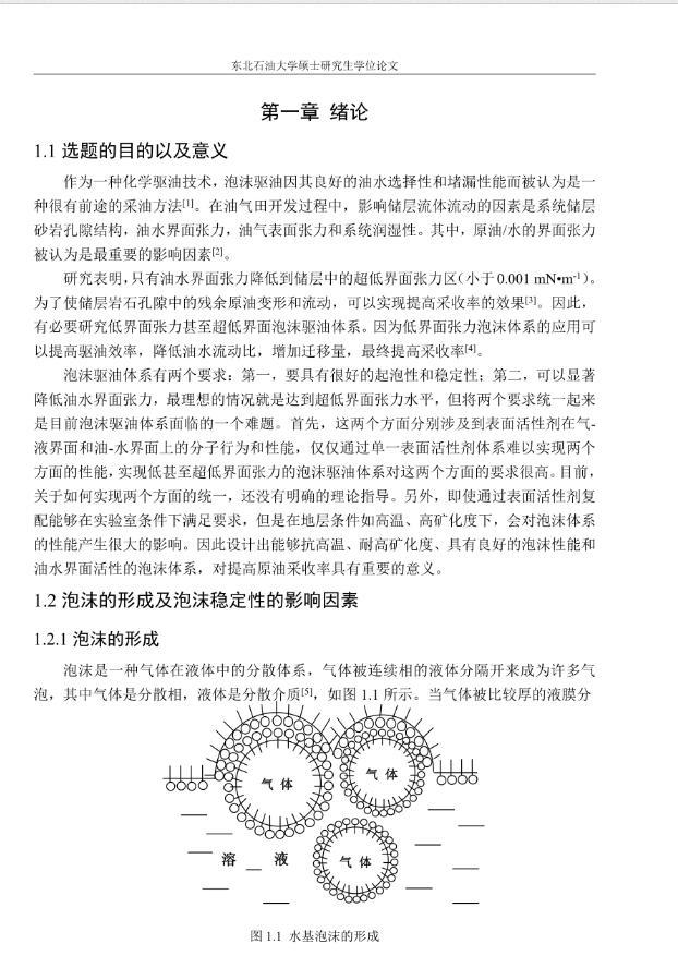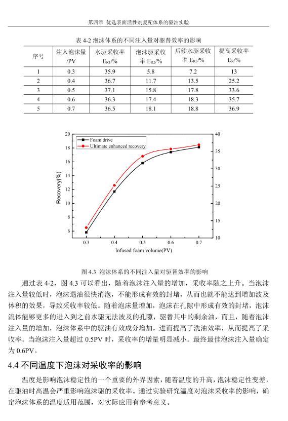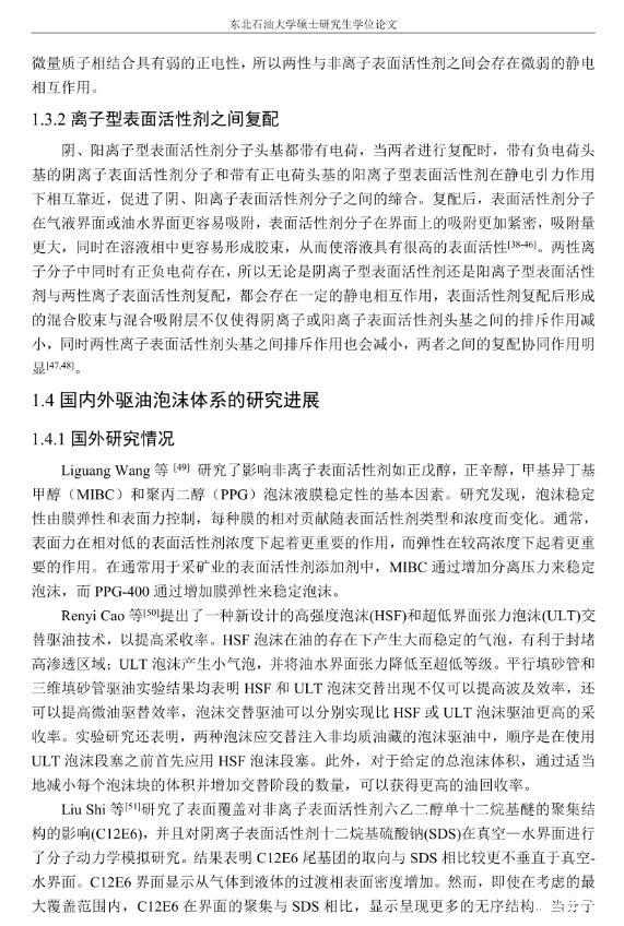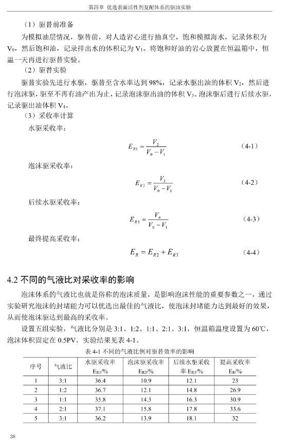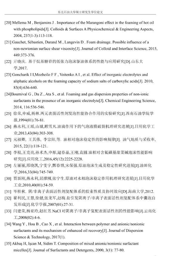 【摘要】:泡沫驅具有良好的驅油性能,在提高采收率方面備受關注。在泡沫驅油過程中,能夠明顯降低注入流體的流度,改善流度比,降低流體的相對滲透率,延緩注入流體的突破時間,封堵高滲層的大孔道,改變液流的方向,較好地實現封堵作用。但泡沫作為一種熱力學不穩定流體,其穩定性受許多因素的影響,包括遇油快速消泡、在高溫和高礦化度的情況下極易破裂等,泡沫穩定性已成為泡沫驅油時亟待解決的問題。另外,用于泡沫驅的泡沫體系很難兼具超低界面張力和穩定泡沫兩種性能,而且文獻報道對這方面的研究較少,這為本文提供了一個新的思路。實驗室合成陰-非離子型表面活性劑十二醇聚氧乙烯醚硫酸鈉(AES)。AES同時具有陰離子和非離子兩種表面活性劑的性能,具有很好的泡沫性能和表面活性,同時與其它表面活性劑具有很好的相容性。最終確定的合成條件為:十二醇聚氧乙烯醚和氨基磺酸的摩爾比為1:2,反應溫度為95℃,反應時間為60min。在合成AES的基礎上,選擇幾種不同類型的表面活性劑進行復配,優選出泡沫性能和表面活性優良的體系,進行耐溫、耐礦化度及耐油性能的評價。實驗采用Waring-Blender法測量泡沫的起泡體積和半衰期,采用吊環法和旋轉滴法測量復配體系的表面張力與油水界面張力。實驗最終優選出泡沫性能與表面活性優良的AES-CTAB復配體系,并確定其最佳復配摩爾比為3:1,最佳總濃度為0.02mol·L-1。復配體系耐溫200℃,耐質量分數20%的原油,礦化度增加可以提高復配體系的泡沫穩定性和表面活性。實驗從氣液比、泡沫注入量和溫度三個方面對泡沫提高采收率的影響進行研究。最佳氣液比為2:1,最佳泡沫注入量為0.6PV,泡沫采收率隨溫度的提高逐漸下降,在60-100℃范圍內泡沫在水驅后提高采收率在30%以上。
