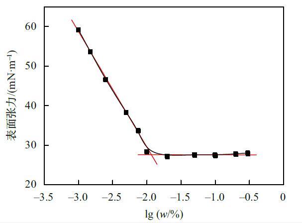 選擇陰離子-非離子表面活性劑復(fù)配體系,以十二烷基硫酸鈉(SDS)和烷基糖苷(APG)復(fù)配組分作為實(shí)驗(yàn)對(duì)象,質(zhì)量比為1:1。實(shí)驗(yàn)結(jié)果見(jiàn)表2。試樣的表面張力曲線圖如圖2所示。