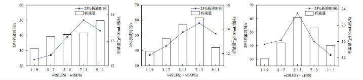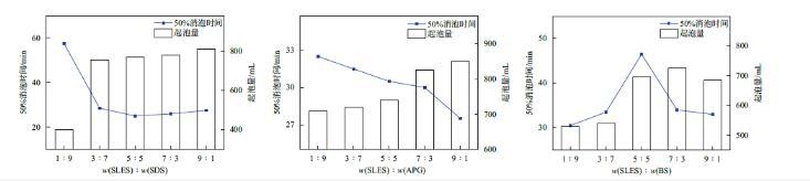 實(shí)驗(yàn)測(cè)得SLES,SDS,APG和BS在w=0.2%時(shí)的50%消泡時(shí)間依次為28.5,45,41和9 min,起泡量依次為800,290,610和700 mL。由圖3可知,對(duì)比三組復(fù)配組分的泡沫性質(zhì),SLES/SDS無(wú)明顯增效,隨著SLES質(zhì)量分?jǐn)?shù)的增加,復(fù)配組分的起泡量和50%消泡時(shí)間接近SLES單組分。SLES/APG的起泡性和泡沫穩(wěn)定性有所提升,其中w(SLES):w(APG)=7:3的復(fù)配組分有較好的泡沫性能,50%消泡時(shí)間、起泡量分別為30 min、825 mL。SLES/BS的起泡量減少,但50%消泡時(shí)間明顯增加,其中w(SLES):w(BS)=5:5的50%消泡時(shí)間、起泡量分別為46.5 min、695 mL。