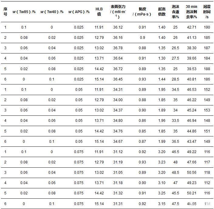 選用非離子-非離子表面活性劑復(fù)配體系,以吐溫85(Tw85)、吐溫40(Tw40)、烷基糖苷(APG)復(fù)配組分作為實(shí)驗(yàn)對(duì)象,實(shí)驗(yàn)中發(fā)現(xiàn)Tw85和Tw40混合溶液無(wú)法產(chǎn)生穩(wěn)定泡沫,因此將Tw85和Tw40復(fù)配組分作為HLB值調(diào)節(jié)組分,添加APG作為輔助起泡劑。實(shí)驗(yàn)結(jié)果見(jiàn)表1。