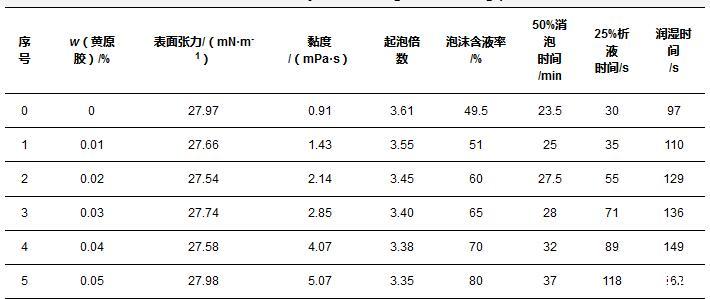 由表3可知,隨著黏度的增加,起泡倍數(shù)呈現(xiàn)下降趨勢(shì),當(dāng)黏度為0.91 mPa·s時(shí),起泡倍數(shù)為3.61,當(dāng)黏度為5.07 mPa·s時(shí),起泡倍數(shù)為3.35。導(dǎo)致起泡倍數(shù)降低的原因可能與流動(dòng)性和表面張力等因素有關(guān),隨著溶液黏度的增加,溶液的流動(dòng)性降低,表面活性劑向氣液界面遷移的能力減弱;由實(shí)驗(yàn)結(jié)果可知,黃原膠的加入對(duì)表面張力無(wú)明顯影響,表明黃原膠屬于非表面活性物質(zhì),它的加入增加了液體的流阻但沒(méi)有增加液體流動(dòng)的推動(dòng)力(即降低表面張力),因此溶液的起泡能力下降。