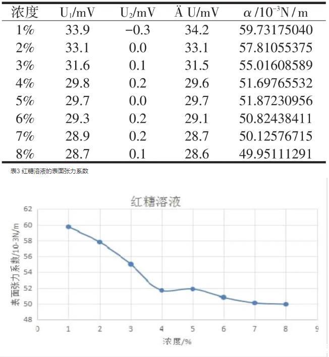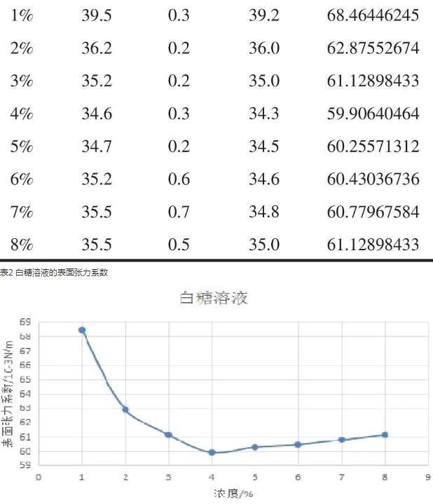不同濃度下白糖、紅糖溶液的表面張力系數(shù)變化